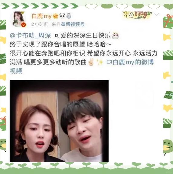29日中午,白鹿在微博上分享了一段视频,为周深送上了生日祝福。她写道:“可爱的深深,祝你生日快乐!终于实现了与你合唱的梦想,真开心能在《奔跑吧》与你相遇。愿你永远保持快乐,充满活力,唱出更多动听的歌曲。”周深在评论区回应道:“谢谢你,白鹿!我也很高兴能认识你,愿你永远幸福快乐!”