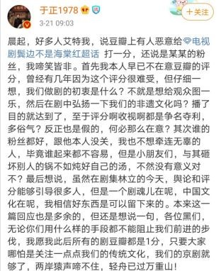 于正作为编剧对《鬓边不是海棠红》鼎力宣传自然也很看重评分,最开始看到豆瓣上新剧被故意打1星于正微博放话:自己早已不在意豆瓣评分,自己制作电视剧的初衷是弘扬非遗文化。评分什么的都很俗气,争名夺利有何意思?