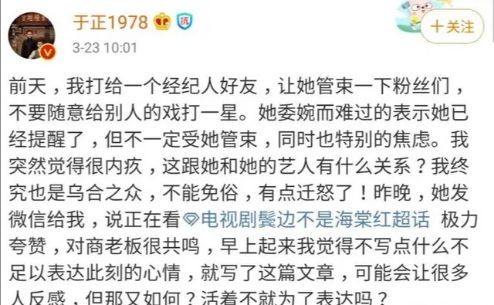 于正故事多,前脚放话无畏新剧1星,后脚联系经纪人好友却删微博