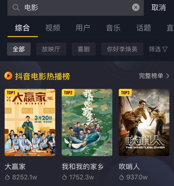 搜索“电影”之后,会弹出一个“抖音电影热播榜”榜单,点击完整榜单便可以看到TOP20的电影列表。在2月23日更新的榜单中,我们可以看到诸如《大赢家》、《疯狂外星人》这样的喜剧片,也能看到《吹哨人》、《心理罪之城市之光》这样的悬疑片,以及《陆垚知马俐》、《三生三世十里桃花》等爱情片。