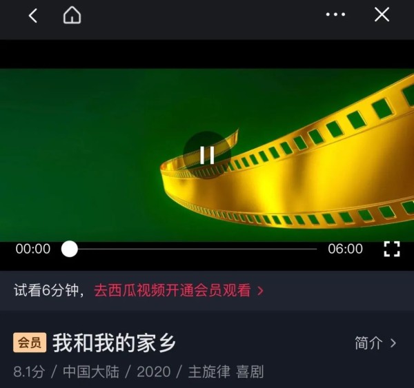 另一部分电影则来自于西瓜视频的片库,其中,有的可以直接观看完整版,有的则需在试看6分钟后,去西瓜视频开通会员观看。在这些电影的播放页面中,用户均可以直接跳转到西瓜视频首页,获取更多的电影片源。