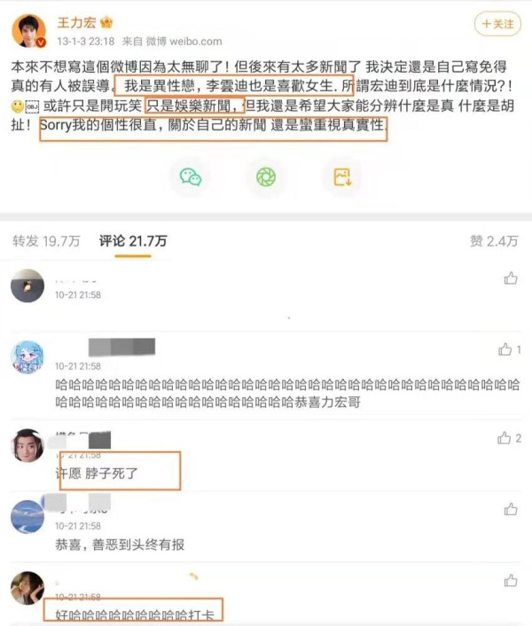 面对汹涌而至的舆论,2013年1月中旬,王力宏放出了一份非常正经的声明,还强调:自己是异性恋。同时王力宏还说:李云迪喜欢女生。
