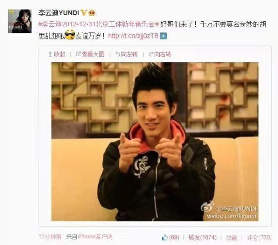 2012年1月19日晚,龙年春晚前夕,李云迪微博发出与王力宏合影,称“今晚
