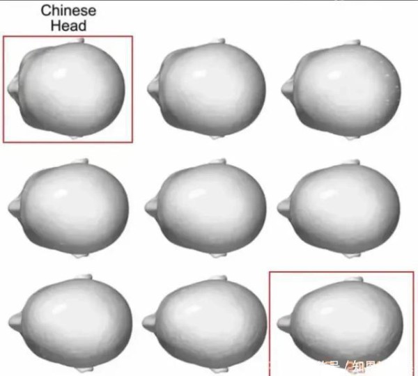 但从颅型整体来看,白人的头才是最大的!是不是很反常识?事实就是如此,以下是现代人常见的几种颅型,左上角是以国人为代表的黄种人,右下角是白人普遍的颅型,你能说白人的头更小吗?