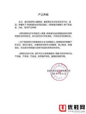 陈宥维公司在25日对外发表声明反驳带妹过夜一事,无奈表示“近日发现有大量跟拍、偷拍博主多次在社交平台造谣”,澄清当天是跟同剧组艺人聚餐,结束后把对方送回住处后,就自行返回居住的酒店,正面回应“不存在恋爱关係”、“艺人(指陈宥维)目前单身”,抨击八卦媒体、营销号多次针对陈宥维断章取义、恶意揣测、造谣,目前公司已经火速取证,保留提告的权利。