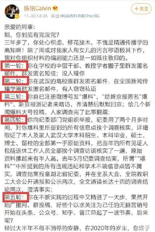 11月30日,陈铭发布长文回应此事。长文中,陈铭称自己遭到了一名同事多年的恶意诽谤,对方处心积虑移花接木,但爆料中提到的所有违规违纪和学术不端信息点皆不属实。