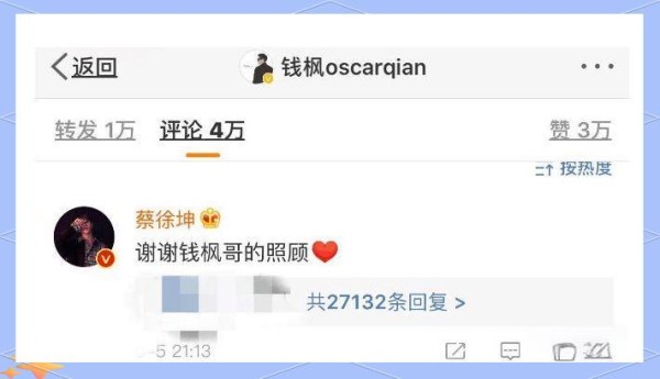 蔡徐坤在钱枫的微博下留言表示感谢,并附上一个心形表情,以示感激之情。看到钱枫的微博,不少人感叹勾起了回忆,然而对于我这个不明真相的吃瓜群众来说,更是云里雾里。蔡徐坤和钱枫之间究竟有何渊源?难道是因为《向上吧少年》?