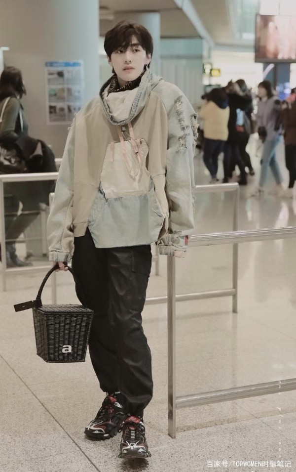 何止是女明星沦陷了呢?男明星也爱上了这只黑色的菜篮子,最近小编心中男明星穿搭王嘉羿也来凑热闹了,衣身各种拼接还破了几个洞的卫衣搭配束脚的工装裤,随性的姿势和帅气的容貌都难以抵挡这个菜篮子的存在感。