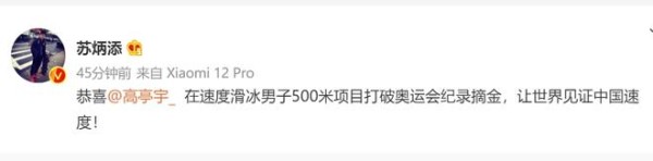 李佳军赛后强调,速度滑冰相当于夏季项目的田径,也就是说,哪怕是在李佳军这样的短道速滑名将的眼中,速度滑冰的地位也相当高,这个项目冠军的含金量,可以说是非常出众的。苏炳添也因此发声:“恭喜高亭宇在速度滑冰男子500米项目打破奥运会纪录摘金,让世界见证中国速度!”这也算是夏奥会与冬奥会速度之王的隔空赞美!那么,恭喜张虹,恭喜高亭宇。