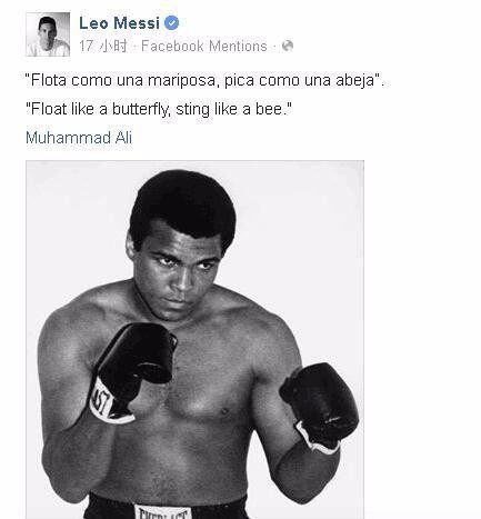 此外,梅西还有一大爱好,那就是练习拳击!梅西之所以一直保持巅峰状态,西媒《世界体育报》曾透露,梅西练习拳击后,这让他的身体变得更为强壮,并且身体各个部位都得到锻炼。梅西如今是狂热的拳击爱好者,现在几乎每天都会带上拳击手套进行训练。阿里去世后,梅西在社交网站中发文悼念拳王,“如蝴蝶般飞舞,如蜂蜜般蜇人。”