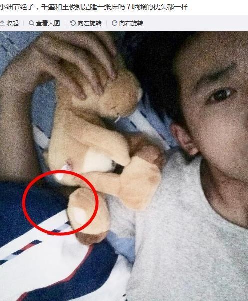 由于当时的被单颜色以及枕头,与王俊凯自拍中的枕头颜色一模一样,顿时粉丝觉得王俊凯、易烊千玺住在一起,不可能两人的枕头颜色一模一样。易烊千玺在晒照时,手里拿的玩偶也成为粉丝认定两人住在一起的证据,主要是之前有粉丝偶遇到王俊凯买了千玺手中的玩偶,两人还一起看电影。