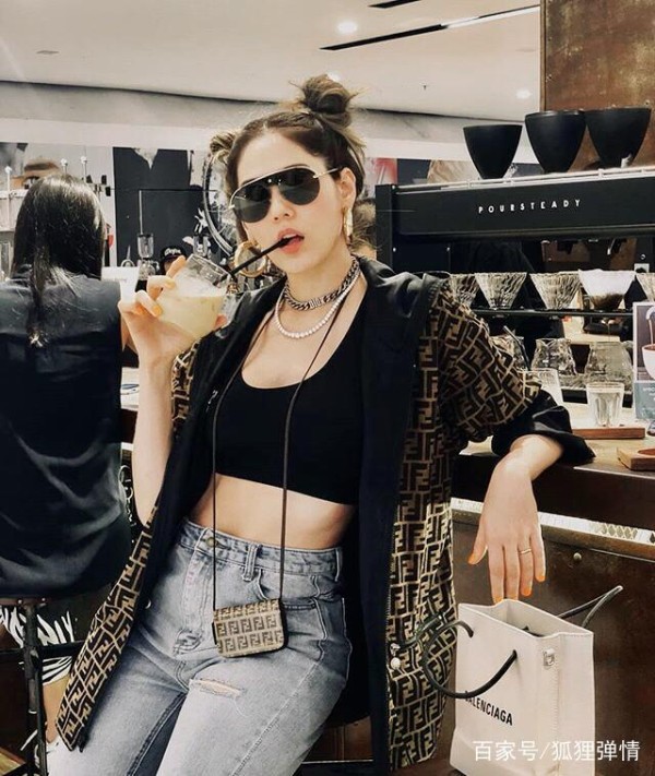 一身芬迪复古老花时尚外套加露脐黑色打底加高腰牛仔裤加非常减龄的哪吒头加chocker配饰、珍珠配饰,耳环墨镜等意想不到的组合,但是事实上的确很酷!