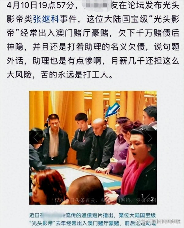 曝光事件的风头一时无两。在娱乐圈,赌博问题似乎无法绕过,就像数不清的牵扯其中的明星一样。早前,我们听说了汪峰被曝嗜赌成性,随后又有关于周杰伦在国外输掉巨额赌资的传闻。然而,最近一则突如其来的爆料揭示了更多细节,指称一位内地“国宝级”光头影帝曾是澳门赌厅的常客。更令人惊讶的是,他并非以自己的名义出入赌厅,而是以助理的名义,引发了一系列的赌债纠纷。这个曝料引发了广泛的讨论和猜测,而葛优、徐峥、张卫健等多位“光头”男演员也被卷入其中。