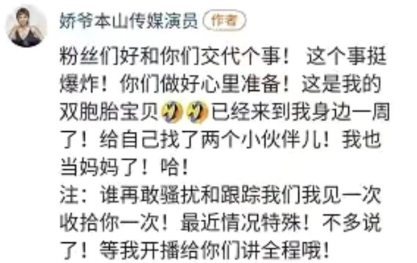 也质疑生下双胞胎就办离婚,如此狗血的剧情是不是娇娇自己编的,为的是增加自己直播间的人气,更有利于直播带货,毕竟养育两个孩子的单亲励志妈妈的人设,更有利于博取同情和好感。