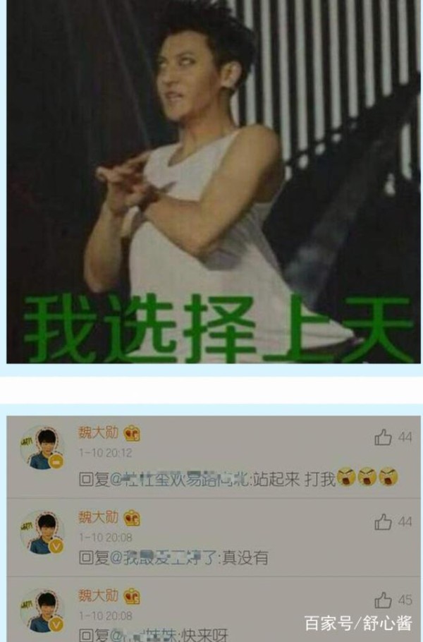 不过当年魏大勋发黄子韬吃藕表情包,也曾经引起过小部分粉丝的误会,魏大勋本尊还下场很皮和粉丝们吵架“你来打我啊”,隔着屏幕都能感受到魏大勋标志性的欠揍(褒义)画风。当然事实上魏大勋也确实并无恶意,他发黄子韬表情同时也发自己的“不堪入目”死亡角度自拍,照片更加吃藕难以直视。