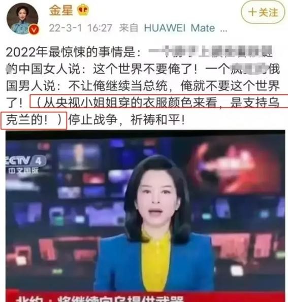 金星姐为啥会得这个称号呢?原来,她之前在微博上发表的一些言论,引发了网友们的热议。有人说她敢于直言,有人说她过于主观,甚至有人说她“病急乱投医”。特别是那次关于央视主持人服装颜色的暗示,更是让金星陷入了舆论的漩涡。金星姐当时发了一张图,暗示央视的某个主持人穿的衣服颜色不对,疑似支持乌克兰。这一下子,可把网友们给炸开了锅!