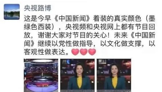央视主持人很快就站出来辟谣了,说衣服的配色是被调整过的,真实的颜色是墨绿色。这下子,金星姐的言论可就显得有点站不住脚了。有网友调侃说:“金星姐,你这是不是有点‘草木皆兵’了啊?”