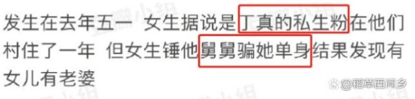近日,丁真的某位女粉丝在网上曝出,丁真舅舅隐瞒自己已婚的事实与其交往,还发生不正当关系,事后,这名女粉丝才知道自己被骗了。