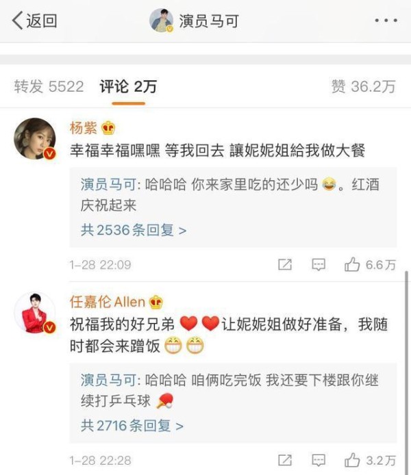 虽然结婚这件事没有引起特别多人的关注,不过,演员杨紫跟任嘉伦还是第一时间送上了祝福并且纷纷表示要去马可家蹭饭,都让马可的妻子王丹妮给自己做饭,而马可则表示杨紫没少吃自己的饭,看来杨紫经常去马可家蹭饭无疑了。