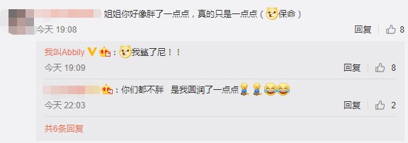 而艾比脸型的变化就连粉丝都能感受得到,毕竟身为艾比的粉丝对于他们所喜爱的艾比自然也是观察入微。评论区中,不仅有人吐槽艾比胖了,更有人留言说艾比越来越像个男孩子了。似乎这次拔牙对于艾比的脸来说是一场巨大的变化。至于艾比看到评论区里的留言到底是会高兴还是伤心就无人得知了。