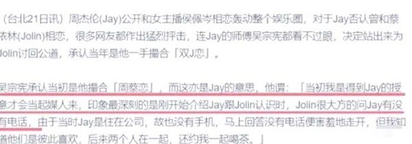 后来,在吴宗宪的节目中,周杰伦与蔡依林相遇并相识。吴宗宪似乎有意撮合他们,然而,与此同时,周杰伦与侯佩岑的恋情被媒体曝光,周杰伦因此被指责为劈腿。对于这一切,吴宗宪应当是周杰伦的坚强后盾,但遗憾的是,他却公开表示周杰伦与蔡依林在一起了,这无疑让周杰伦陷入了劈腿的舆论漩涡。