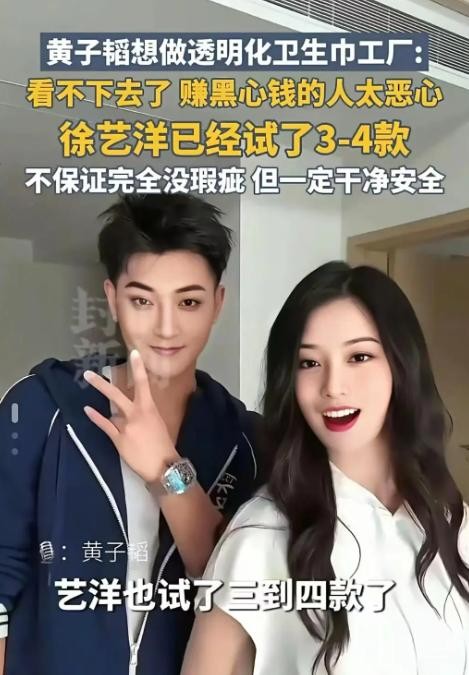 3 月 22 日,黄子韬在直播里大大咧咧地宣布要推出自己的卫生巾品牌,理由很简单,他看不惯那些黑心商家靠着女性用品赚暴利。他还说自己的妻子徐艺洋已经试用了好几款产品,虽说不敢保证十全十美,但安全问题绝对有保障。这话一出口,网上瞬间炸开了锅,有人夸他有想法、有担当,可也有人持怀疑态度。