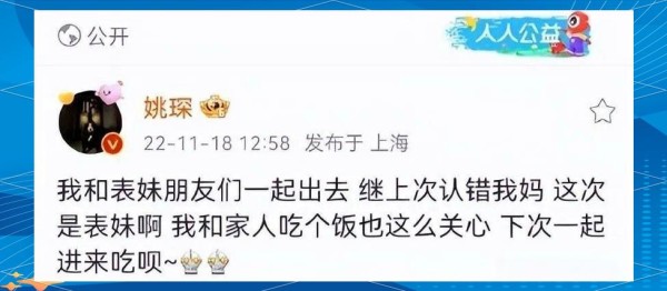 辟谣!姚琛发文否认恋情传闻,称是与表妹聚餐