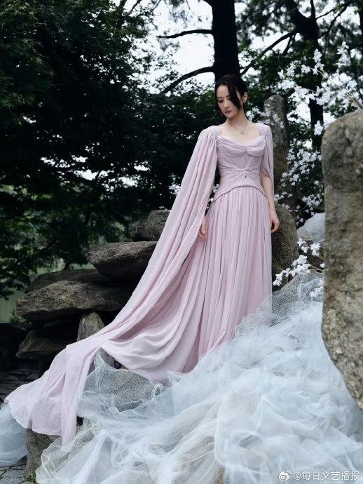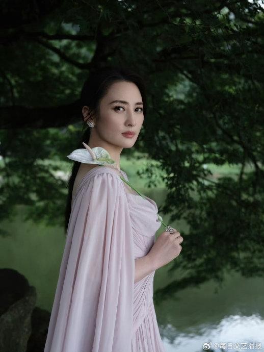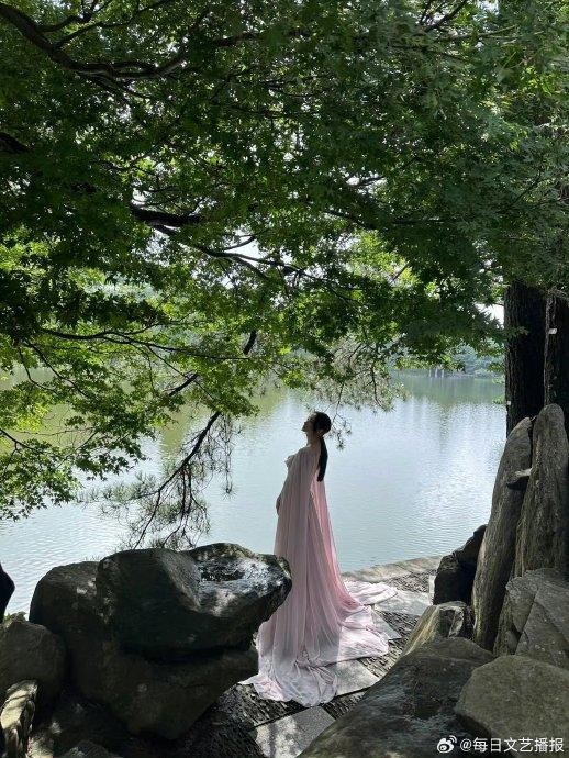 蒋勤勤庐山大片曝光,藕粉长裙如琴湖畔展古典美