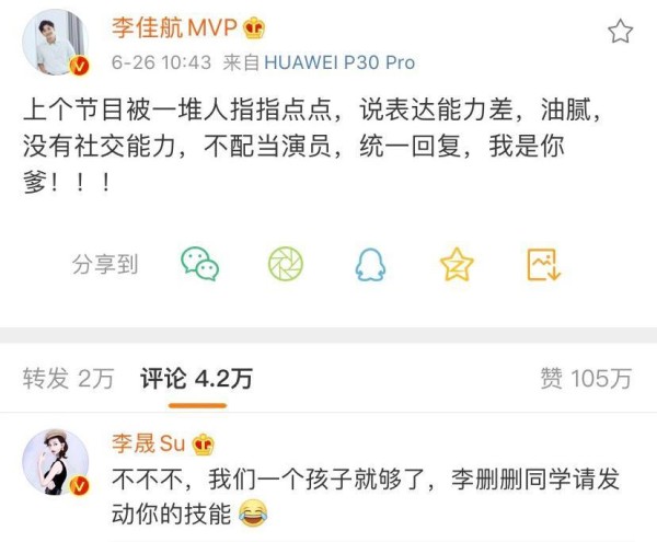 发文后,作为妻子的李晟也在评论区留言:我们一个孩子就够了。用调侃的方式也侧面支持了老公的发声。这件事情的起因源自李佳航与李晟参加了《婆婆和妈妈》这档综艺节目,在节目中让大家认识到了不一样的李佳航。其实在节目刚开始,李佳航就因为自己有社交恐惧症而情绪低落,这与大家在影视剧中看到的李佳航不一样,而且李佳航在节目中和丈母娘住一起,平时也不善言辞,家里也都是老婆和丈母娘料理,就给了网络喷子一些素材,不断的喷李佳航,导致现在他忍无可忍,公开发声。