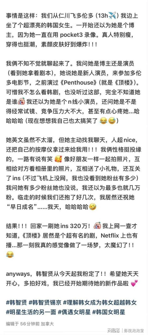 俩人不知不觉就聊起来了。韩智贤特别亲切,说自己是个新人演员,要去参加多伦多电影节。网友后来回忆说,当时甚至有点心疼她,觉得她英文不太溜还只身闯荡,真的很拼。航程长达13个小时,她们像老朋友一样分享生活,互相拍照,看对方相册里的照片,还交换了小礼物。网友甚至送上了“祝你早日成名”的真诚祝福……