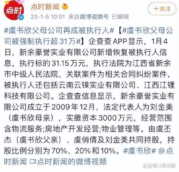 2025 年 5 月 19 日,虞书欣工作室发布其与黄杨钿甜的机场合照,网友发现背景车辆牌照与黄杨钿甜父亲杨伟名下公司用车一致。虞书欣爷爷虞锡元曾任江西新余钢铁集团工会副主席,家族企业新余市华尚矿业 2017 年与新余钢铁集团合资成立公司(虞丕杰持股 15%),该公司同年注销。虞书欣母亲刘金美关联企业 2023 年因合同纠纷被执行,截至 2025 年 5 月恢复执行金额 31.15 万元,刘金美未被列为个人失信被执行人。