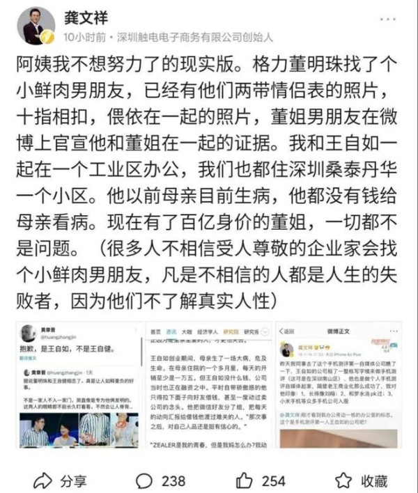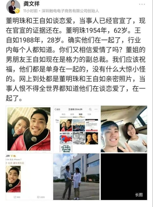 前不久,一个叫龚文祥的人曝光了很多新闻,仔细看了内容后,他失去了离心力。这个男人声称董明珠爱上了比自己小34岁的王自如。