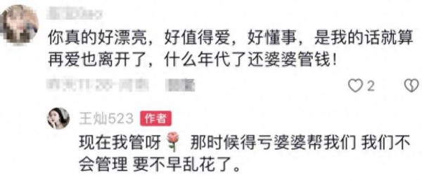 网友对于王灿的婆婆管钱一事还记忆犹新。他们认为,尽管王灿既漂亮又温柔贤惠,与杜淳相爱,但她没有掌握家庭的经济大权却选择了离开。然而,王灿很快作出了回应,她透露现在家里的财务就由她来管理。此外,她还以高情商的方式表示:“幸亏有婆婆当时帮助我们,因为我们不懂得如何理财,要不然早就花光了。”可以说,王灿真是嘴巧甜美,难怪嫁给杜淳后,婆婆都像待她亲生女儿一样。