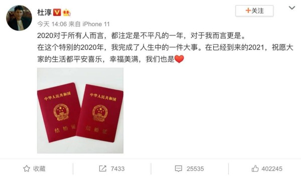 狗血的2020在郭敬明和于正的深夜道歉函中落下帷幕。新年伊始,旧恨暂平,随着万象更新,娱乐圈也喜讯频传。缺席湖南卫视跨年晚会的当红主持人谢娜,于1月1日中午发微博证实怀上二胎宝宝;紧接着,演员杜淳突然公布婚讯,宣布自己从油腻大叔转身成为已婚男人,不过,登上热搜的关联词却是:“杜淳老婆是谁?”