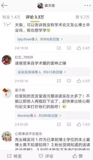 几天之中换了天地,前脚还是刚上春晚的学霸演员前途无量,后脚就陷入了学术不端的漩涡。在翟天临最新一条微博的留言中,不少网友都在求论文求解释。还有粉丝很失望,说:“在脱粉的边缘还有点不死心地徘徊……死磕论文党表示学术不端不能忍。”
