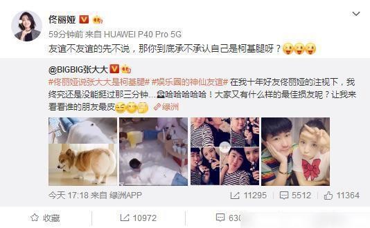 张大大在社交平台上发文谈及和佟丽娅在一起时候的趣事,两个人一起做平板支撑,而张大大没有挺过三分钟,不仅如此还被佟丽娅说成柯基腿。随后,佟丽娅转发了张大大的内容并且进行回复,佟丽娅表示“友谊不友谊的先不说,那你到底承不承认自己是柯基腿呢?”