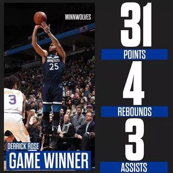 31分3助攻4篮板,24投12中,第三节单节17分,下半场29分,还有最后的巨星时刻,罗斯完完全全地抢了今天26分钟30分表现同样出色的唐斯的风头。