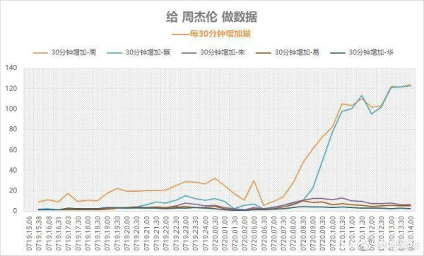 从一位微博认证为@刘清华的网友整理的数据来看,周杰伦和蔡徐坤的微博超话数从7月20日上午8点左右开始飙升,到下午两点左右已将朱一龙、易烊千玺和华晨宇等流量明星远远甩在了身后。值得注意的是,到了中午12点15以后,两人的数据走势几乎重合,但蔡徐坤始终维持着对周杰伦的微弱优势。