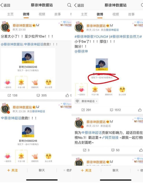 从微博认证为蔡徐坤数据站的账号所发布的信息来看,iKun会把蔡徐坤与第二名的超话数据差距维持在10万左右,当数据小于5万时,就会通过抛分来控制排名。蔡徐坤粉丝们强大的数据控制能力由此可见一斑。