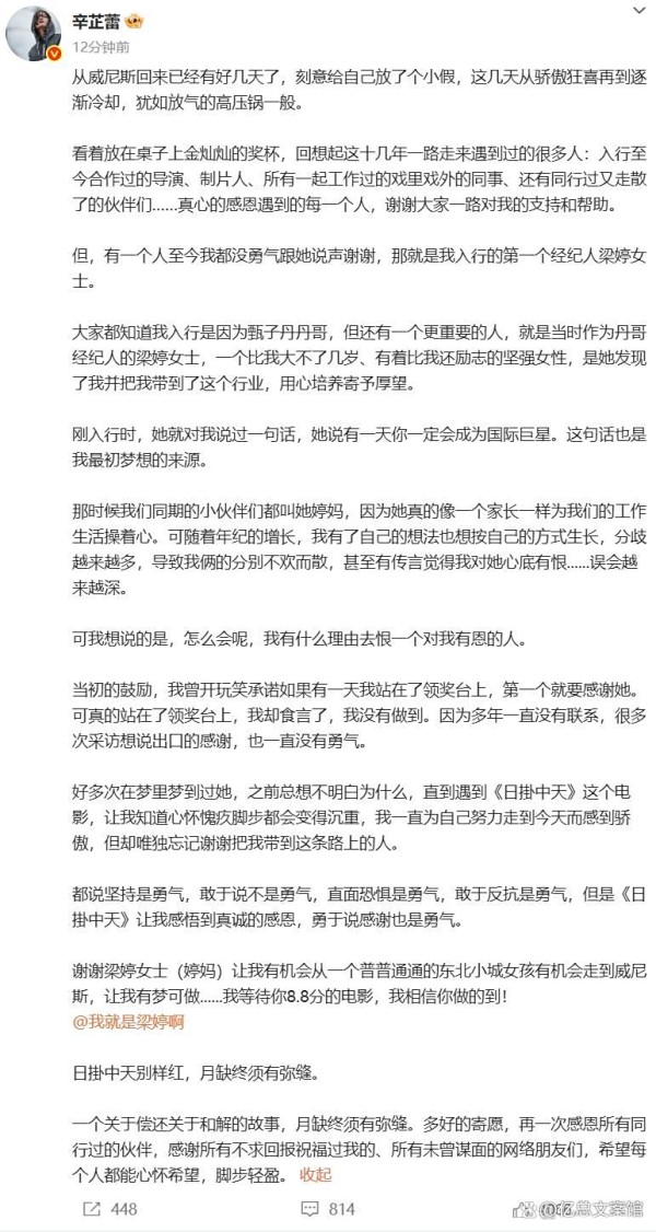 辛芷蕾发长文感谢第一个经纪人!“国际巨星梦想来源于她”,梁婷千字长文回应:我对你爱恨交织