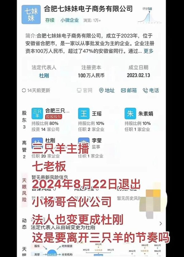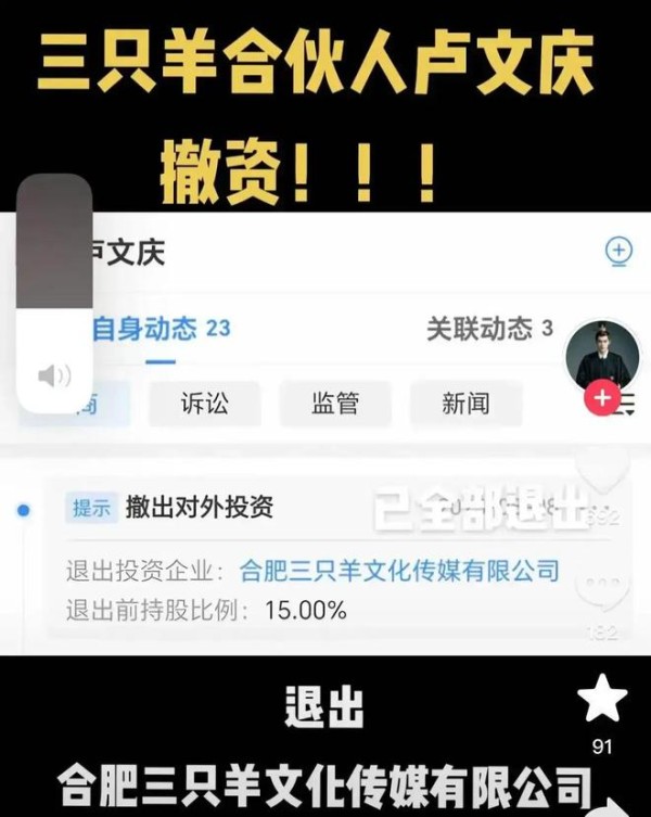 与此同时,网上爆料,卢文庆和七老板纷纷退出了三只羊相关公司。其中,卢文庆是前两天从三只羊文化传媒撤资,他原本有15%的股份,如今直接退了,和这家公司没有任何关系了。
