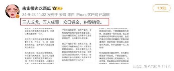 身为七老板与卓仕琳的师母,大杨哥的妻子发表了一篇长篇文字,直接对“录音风波”作出了回应,其言辞尖锐,文采出众,真乃名副其实的才女。大杨嫂引用了“三人成虎,众口铄金,五人成章,积毁销骨”这一古语来形容此次录音事件。