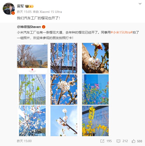 雷军与樱花的双向奔赴细心的网友发现,雷军已将他的微博头像改为在武大樱花树下与车的合影。