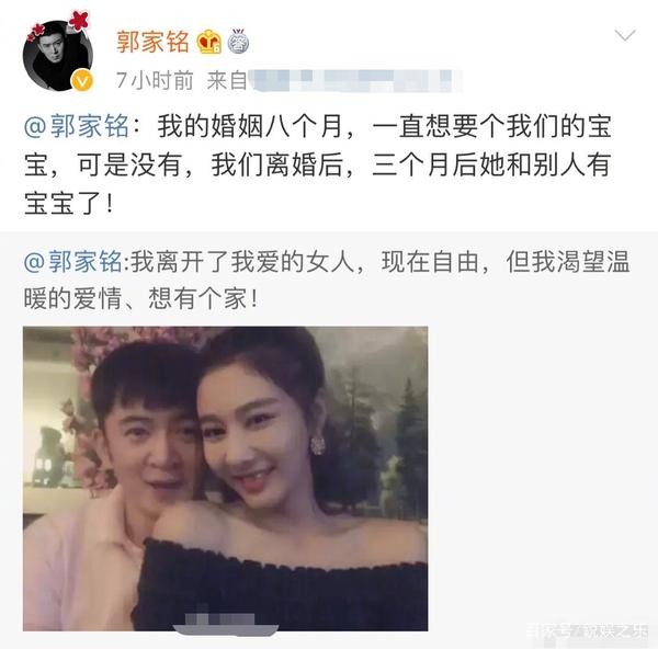 刚开始,很多吃瓜群众对此很疑惑,随后郭家铭转发自己的动态并做出了解释,说道:“我的婚姻八个月,一直想要个我们的宝宝,可是没有,我们离婚后,三个月后她和别人有宝宝了!”