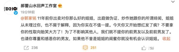 对于郝蕾工作室的回应,网友们认为信息量很大,先是曝出对方曾出卖过郝蕾,随后又对他现在表白郝蕾感到恶心,认为这是郭家铭为了走红的炒作行为,最后还不忘曝出他的性取向,真是绝了。