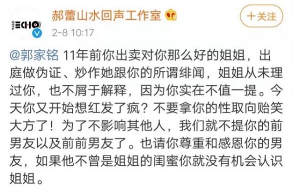 郝蕾工作室回怼郭家铭,想红发了疯,不要拿你的性取向贻笑大方