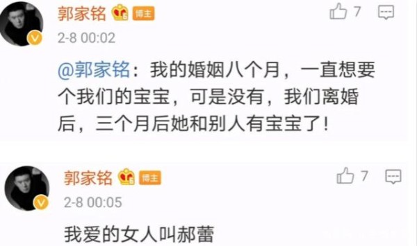 到现在,郭家铭之前在社交平台上发文宣布离婚,并称道:“是前妻怀上了别人的孩子,自己迫不得已才已婚的”。随后又紧接着又发了一条表白:“我爱的女人叫郝蕾”。