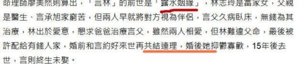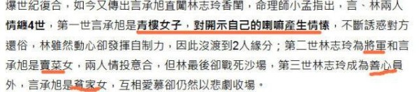 还有一位命理师廖美然则针锋相对的指出,两人的前世是一段露水姻缘。林志玲的前世是富家小姐,言承旭出身贫苦,两人相知相爱,都将对方视为终身伴侣。言承旭的父亲卧病在床,林志玲出钱帮忙治病。但是这对相爱的人并没有得到家里的支持,只有一段露水姻缘。最终林志玲被许配给有钱人家,十五年后郁郁而终,言承旭则终身未娶。有情人相爱却不能在一起,悲惨的结局真是让人唏嘘感慨。