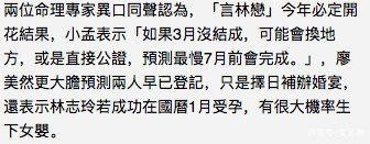 除了奉献精彩的故事,他们还预测“言林”今年必定开花结果。小孟断言他们最迟到7月一定会结婚。廖美然则大胆推测,两人可能已经登记,只是找时机补办婚宴,林志玲婚后很大的几率生下女儿。总之,命理师认定两个人是前世今生的缘分,注定要在一起的,至于预言到底能不能成真,我们也只能拭目以待了。(本文由文艺圈作者“入江云”原创,未经许可不得转载)