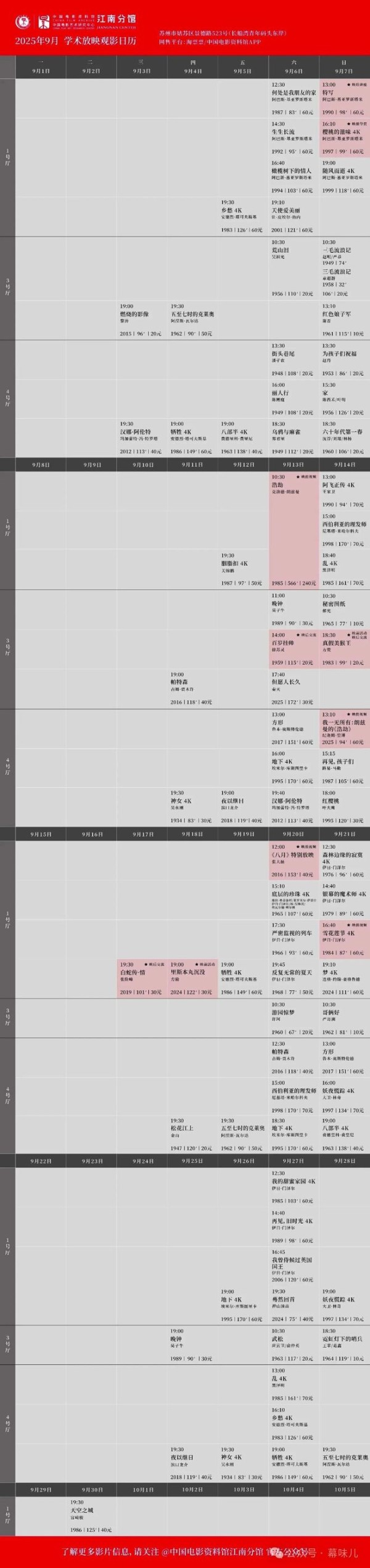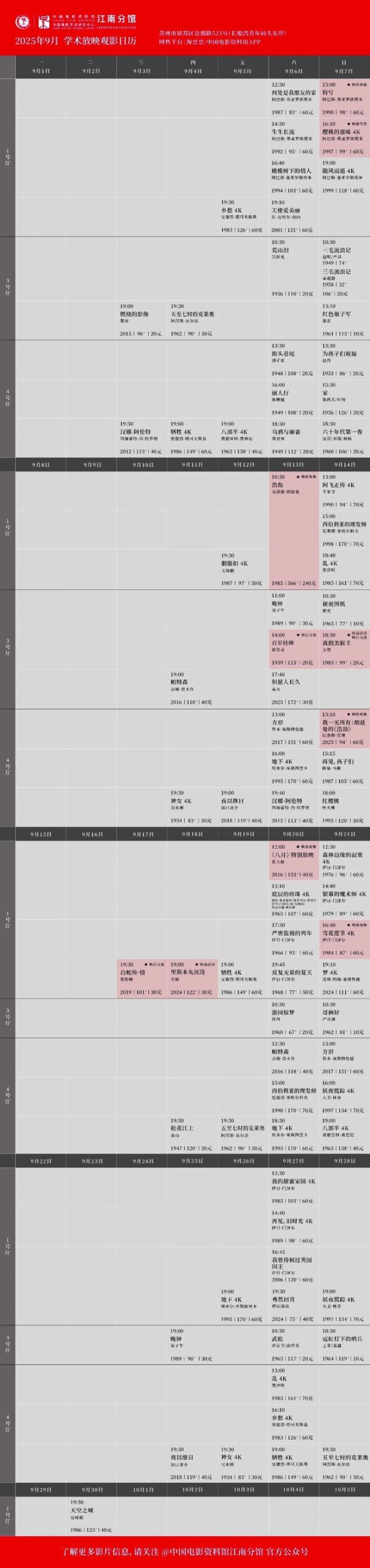 为便于影迷朋友提前行程计划,10月苏州江南分馆精彩放映即将陆续公布,10月1日至7日“国庆七天乐”四大主题近五十部影片闪耀姑苏,值得你来。所有场次均可在淘票票、中国电影资料馆APP购票,具体排片见末图,祝大家观影愉快。❤️